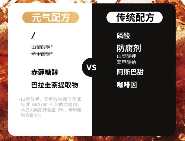 从配料上看,元气森林对标市面上的无糖可乐做出来四点创新,一是去磷酸,二是去山梨酸钾、苯甲酸钠两种防腐剂,三是以天然代糖赤藓糖醇代替人工甜味剂阿斯巴甜,四是以天然的巴拉圭茶提取物代替人工咖啡因。贯彻一如既往的健康“清零”路线,元气森林从配方上对可乐的各种不健康成分做了全面升级调整,但失去“肥宅”的肥宅快乐水还能快乐得起来吗?