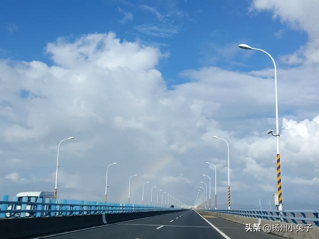 无意间放低视线,却发现有一道彩虹从桥左边前方,横向往桥上空环形延伸。彩虹比较粗壮,赤橙黄绿青蓝紫七色,每一色都能分辨出来。雨住风未停,这美好的彩虹,是如何生成的啊。