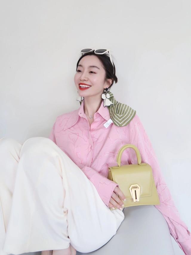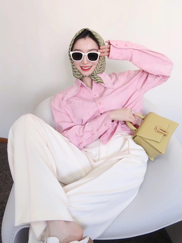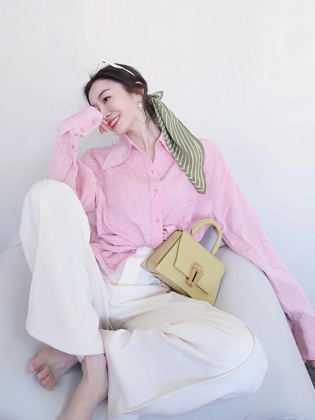 博主就应用了一件粉色的衬衫,在搭配上白色的阔腿裤,特别的清爽养眼,温柔减龄,整个人的气质都优雅大方了不少,而且还运用非常夸张的白色的耳坠和绿色丝巾点缀,整体的造型更多了一份个性洒脱的时尚魅力,尤其是这一条绿色的丝巾绑在头发上,起到了画龙点睛的作用,和粉色形成一个对比,但是又不会让人觉得很俗气。
