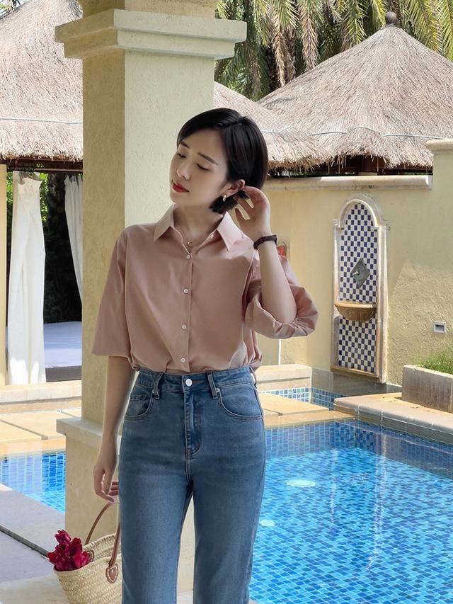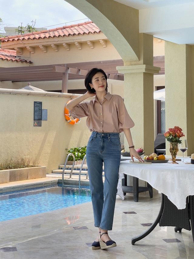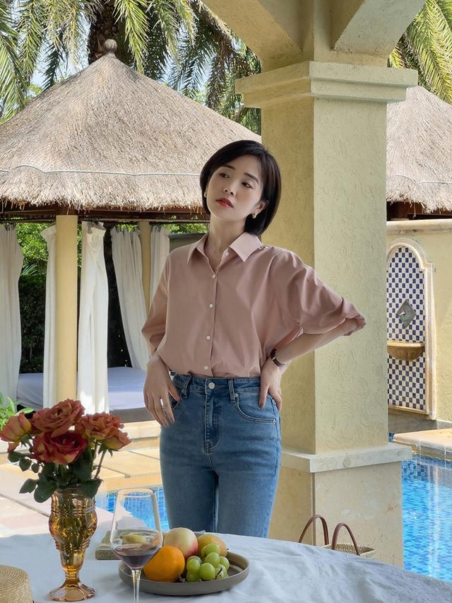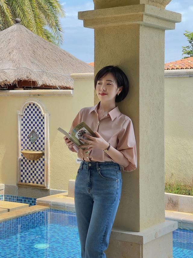 衬衫和牛仔裤搭配也比较的偏日常休闲一些,不会给人特别正式严肃的感觉,尤其是这种甜美的粉色衬衫,效果就更加明显了,想要尝试粉色,但是又想要稍微利落大方一些的感觉,就可以借鉴博主的这一身搭配造型。