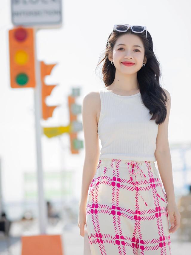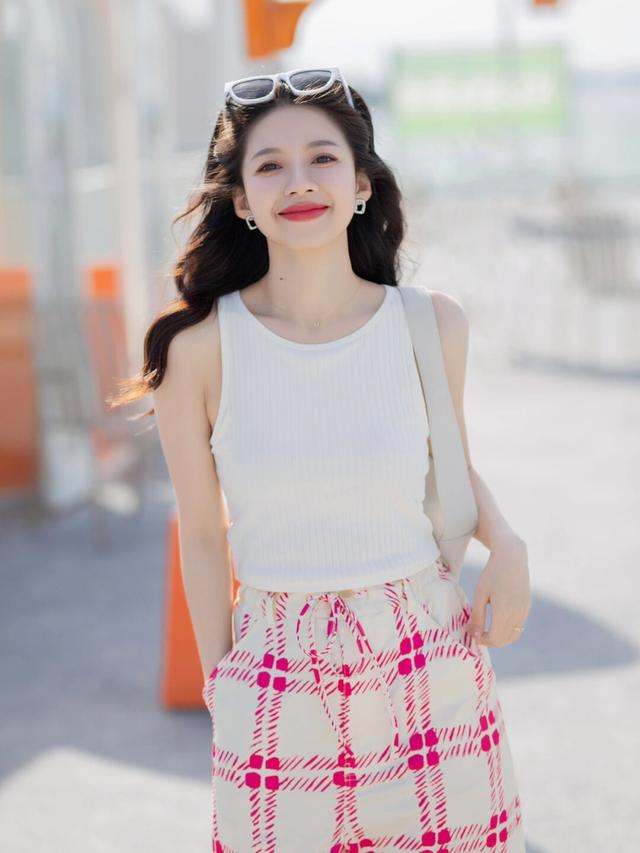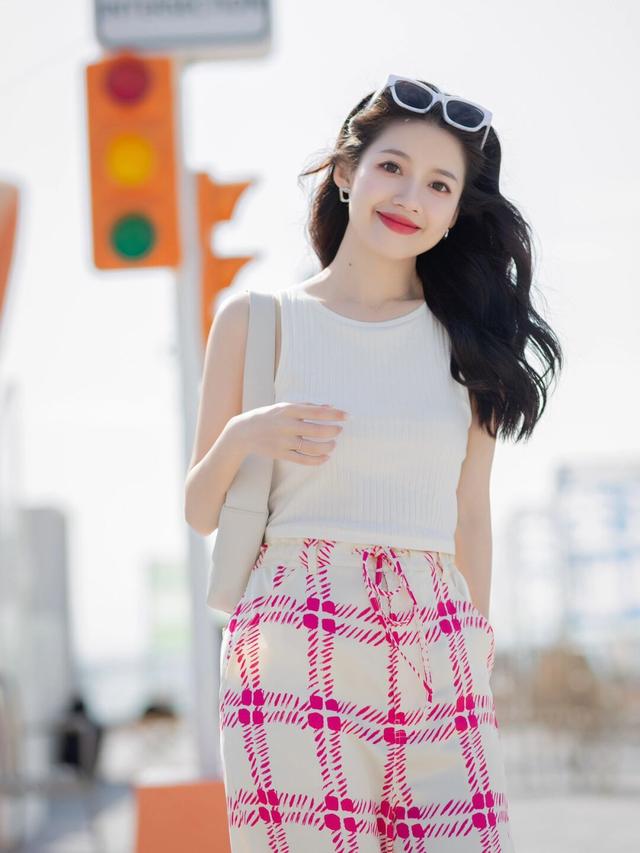 我这位博主就运用了一件白色的修身背心来搭配上一条格纹的阔腿长裤,上短下长的搭配不仅拉长了下半身的比例,而且看上去有点个性酷炫的效果,甜酷甜酷的风格真的太爱了,裤子上的粉色也借鉴了火龙果红的颜色,少量的点缀,更显精致,元气满满,时髦干练又洋气。