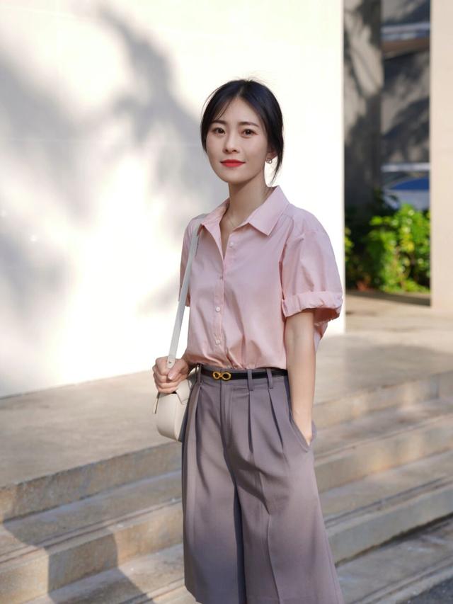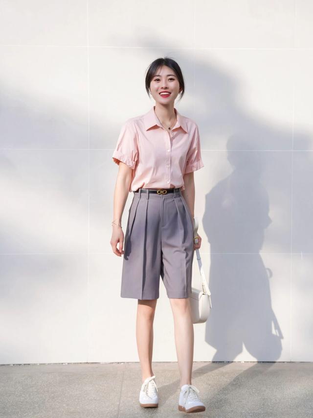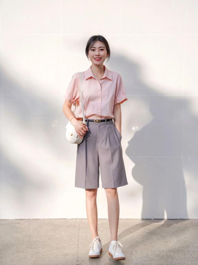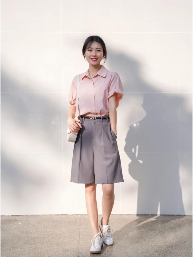 粉色衬衫版型设计会比较的简洁大方一些,而且是这种短袖的剪裁设计,增强了造型的露肤度,看上去会更加的清爽透气,下半身再搭配上了一条灰色的五分短裤,采用的是这种顺滑垂坠的西装面料,更加的利落大气,时髦干练,自带一种中性的干练和洒脱气质。