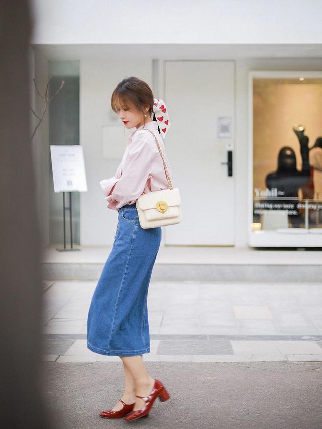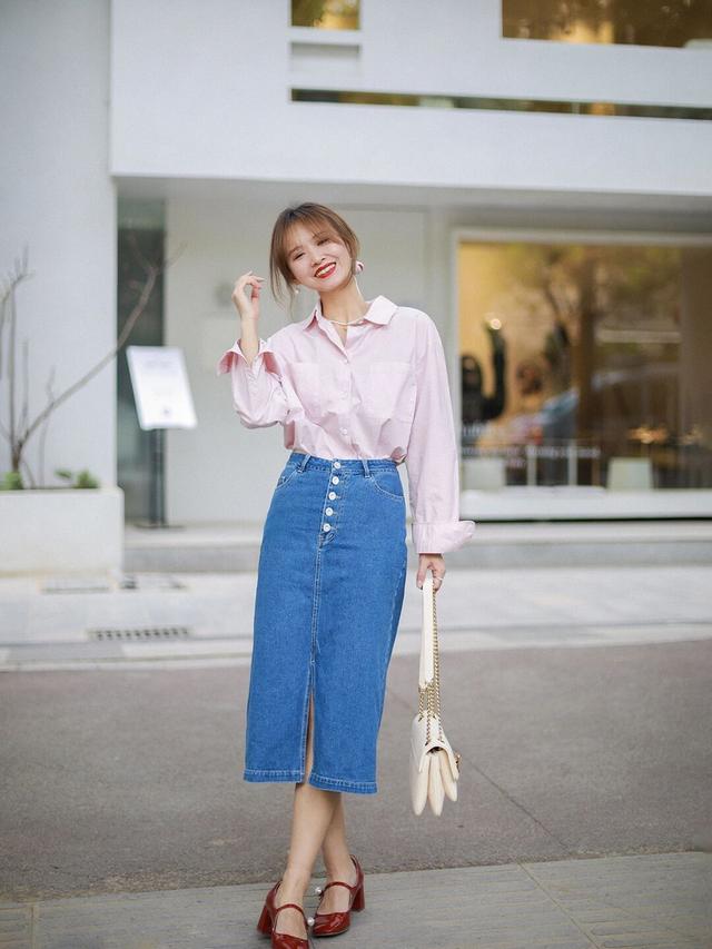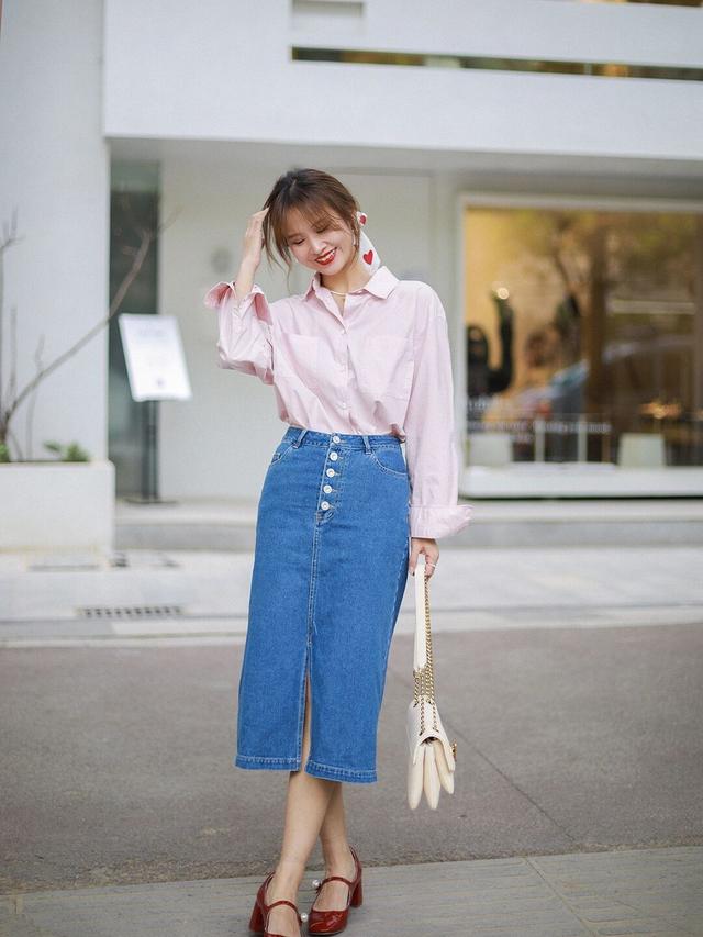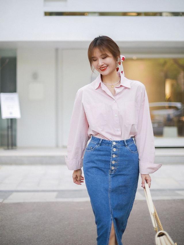 今天也简单地来说一说关于粉色系衣服的一些搭配方式,首先就是这一件粉色的衬衫了,我们可以用这种浅粉色的衬衫和牛仔开叉裙进行搭配,都是比较节约日常的基础款单品,颜色搭配上也比较的常规一些,而且这样一身搭配,作为职场穿搭的话会更加的甜美温柔一些,作为日常休闲穿搭又稍微带着一点点的正式和利落感,很有个性。