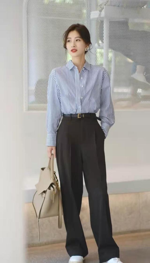 采用西装材质做成、阔腿款式的西装裤,最遮肉、最显瘦,穿上它,八十斤的腿和一百多斤的腿,没什么区别。