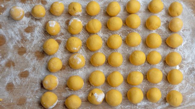 2、现在来和面,分次添加300克面粉,揉成一个光滑成型的面团,分别搓成一个个小圆球;