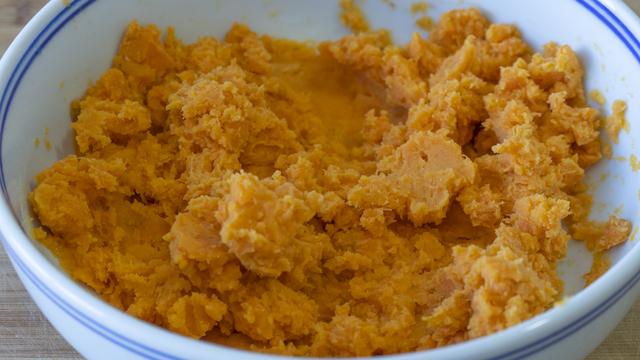 3、倒出来趁热加30克白糖,捣成细腻的红薯泥。