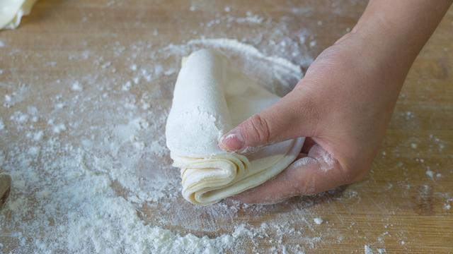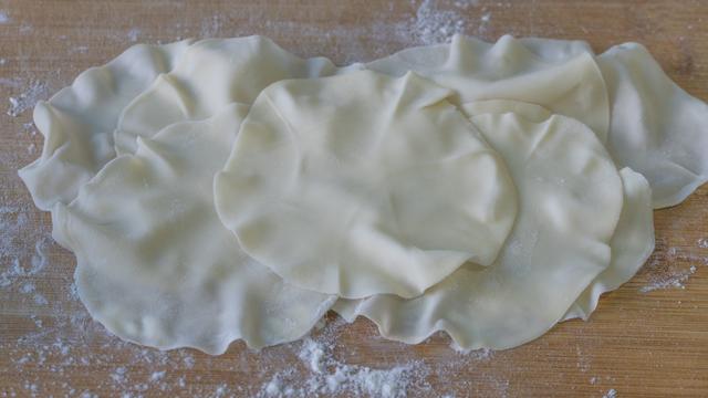 16、我们再来准备3块钱的饺子皮,10张为一组,撒点干面粉后稍微地擀开擀大一点,然后再捏出花边。