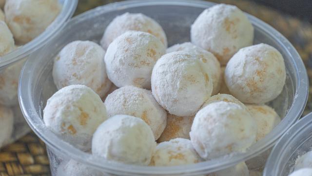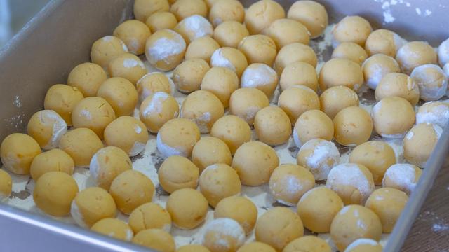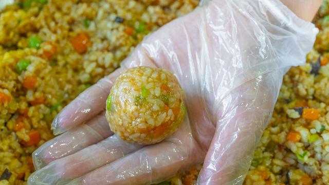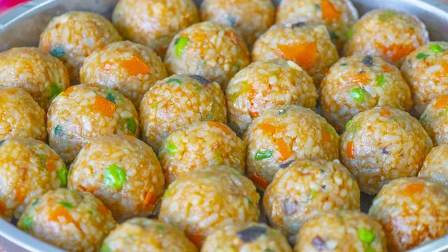 14、这个糯米饭调的馅儿也是超级香,先稍微的放凉一会儿,然后取一小坨,先捏瓷实,再搓圆,搓成像这样一个小圆球就可以了。