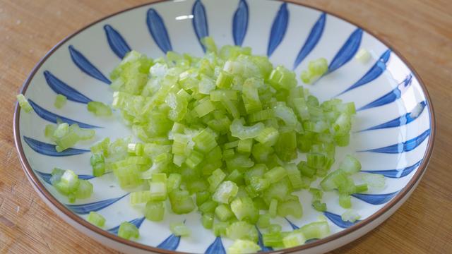 5、再来两根儿芹菜,洗净后切碎,芹菜是特别香的,放一点到馅儿里面特别好吃。