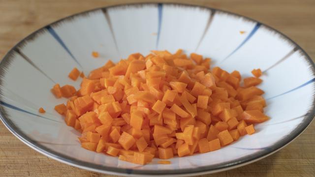 6、胡萝卜也来一根儿,洗净后先削皮,然后再切成小丁。