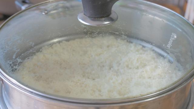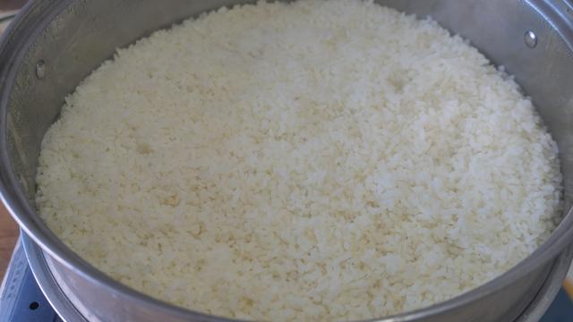 10、这时候糯米也蒸熟了,用筷子挑起来看一下,没有夹生就是熟透了,取出来后先放在一旁。