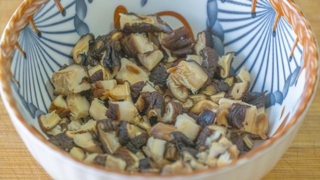 9、这时候香菇也泡好了,挤干水分后切成小丁,香菇水不要倒了,可以留着等下用,这个香菇和香菇水都是整个馅儿的灵魂之处,所以强烈建议一定要加。