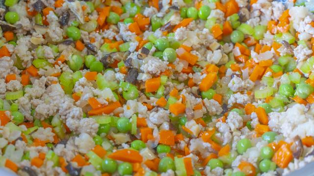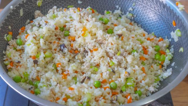 12、接着倒入胡萝卜、香菇、青豆、芹菜,翻炒均匀后把糯米也倒进来一起炒。