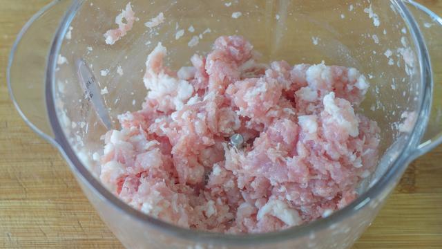 8、最后再来半斤猪肉,洗干净后切成大块儿,然后加绞肉机里面打成肉末,喜欢吃点颗粒感的就自己手工剁馅儿吧,打好后倒出来先放一旁。