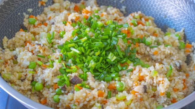 先把米饭尽可能地炒散,接着来调味儿,盐、鸡精、生抽、蚝油,继续翻炒均匀上色入味儿。