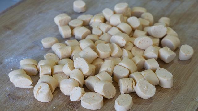 6、揉好的面团儿取出来分成三份,再分别搓长条,切成大小均匀的小面剂子,分好先搓圆。