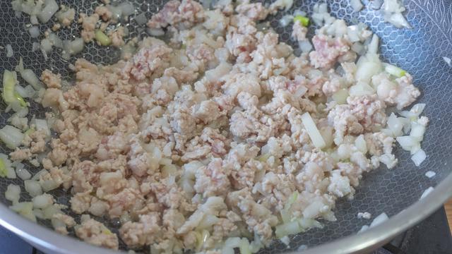 11、接着起锅热油,下洋葱爆香,再把肉沫倒进来,大火翻炒至变色。