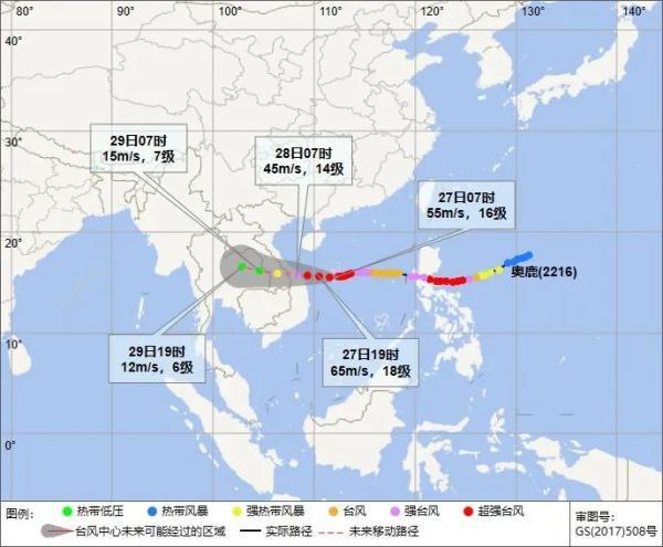 9月27日7时30分,海南省气象局继续发布台风三级预警。预计“奥鹿”将以每小时25公里左右的速度继续向偏西方向移动,27日经过西沙群岛南部海域,强度维持或略有加强,将于28日早晨到中午在越南东部沿海登陆,登陆后强度快速减弱。
