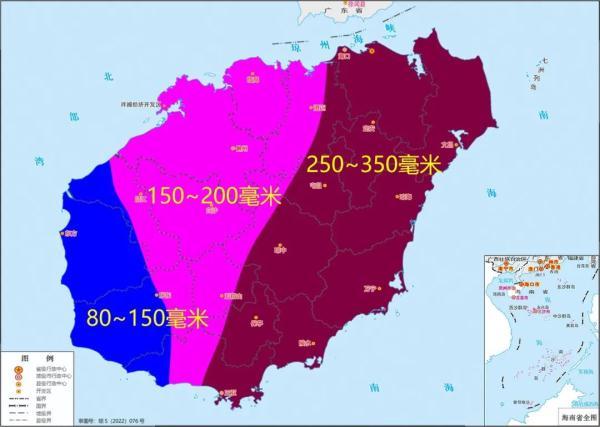 预计,9月27日08时—30日20时各地累积雨量:西沙群岛、海口、定安、屯昌、琼中、文昌、琼海、万宁、陵水、保亭和三亚等市县250~350毫米;临高、澄迈、儋州、白沙、昌江和五指山等市县150~200毫米;东方和乐东80~150毫米。