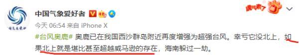 记者从海南省气象台了解到,今年第16号台风“奥鹿”已于27日凌晨再次加强为超强台风级,7时中心在距离永兴岛偏南方向约140公里的南海中东部海面上,中心附近最大风力16级(55米/秒),七级风圈半径200~280公里,十级风圈半径100公里,十二级风圈半径50公里。