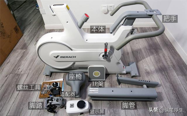 将包装打开,有一个动感单车的本体、把手、座椅、IP架、螺丝工具、适配器、脚踏、显示屏、脚管等,配件齐全。