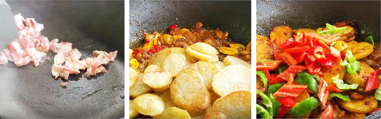 9、煎至土豆表面金黄酥脆控油捞出备用,另起锅烧油,油热放入五花肉煸炒出油脂。