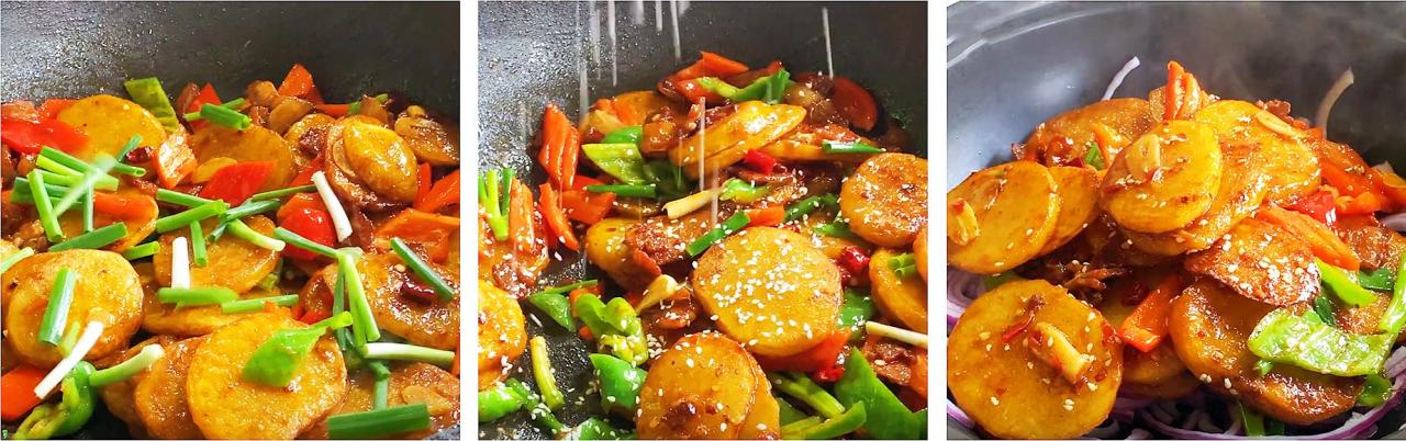 13、再撒入提前准备好的葱段快速翻炒,再撒入一把白芝麻点缀,关火出锅,倒入砂锅中,小火慢煮,就可以开始享用了。