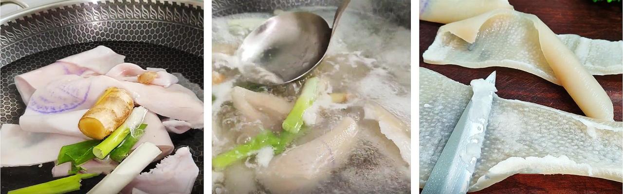 3、水开以后把表面的浮沫撇干净,继续煮5分钟左右,把猪皮控水捞出,稍微晾凉备用。