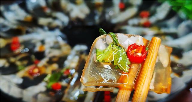 10、把皮冻完全凉透,弹性十足,把猪皮冻先脱模,再把猪皮冻切成自己喜欢的形状摆入盘中。