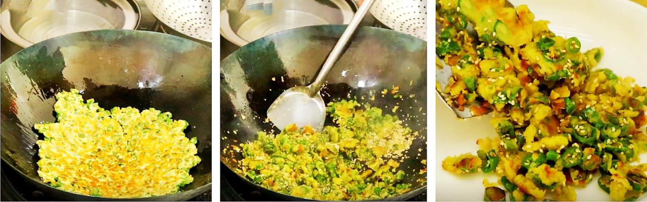 7、用勺子慢慢的把辣椒铲成小块,加入一勺香油,再加入一把白芝麻快速的翻炒。