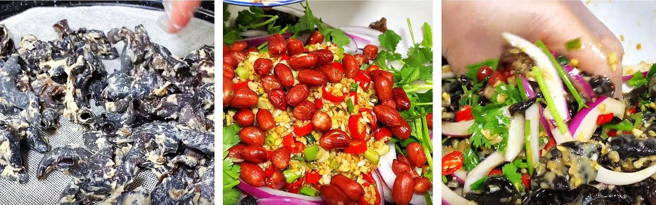 9、蒸好的木耳取出来晾凉,再和洋葱放在一起,再放入一把炸好的花生米,把调好的料汁也倒入大碗中,下手充分地抓拌入味,即可装盘开始享用了。