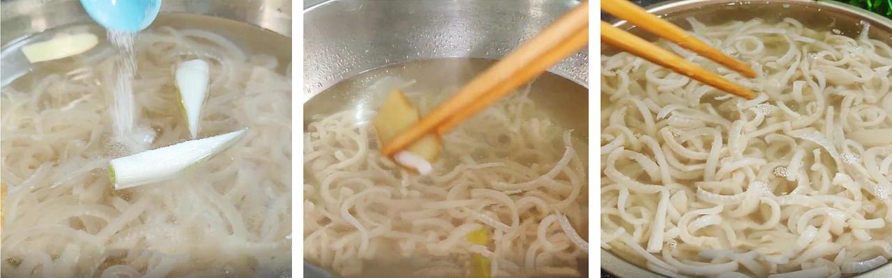 4、起锅烧水,加入一勺食盐增加底味,把切好的豆腐皮放入锅中焯水20秒钟,控水捞出备用。