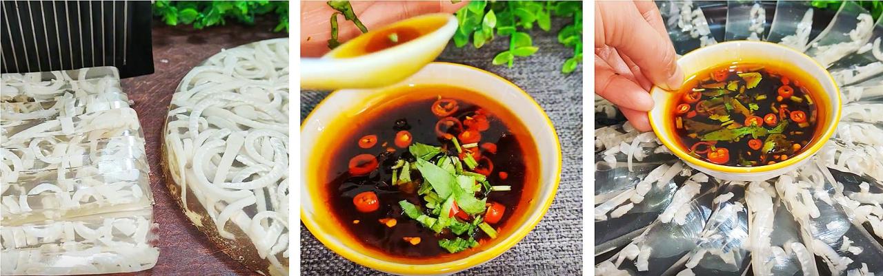 11、小碗中加入蒜末、香菜、小米椒、两勺生抽、一勺葱油、一勺香醋、一勺鸡精、一勺蒸鱼豉油、一勺辣椒油、一勺香油搅拌均匀,就可以配上猪皮冻开始享用了。