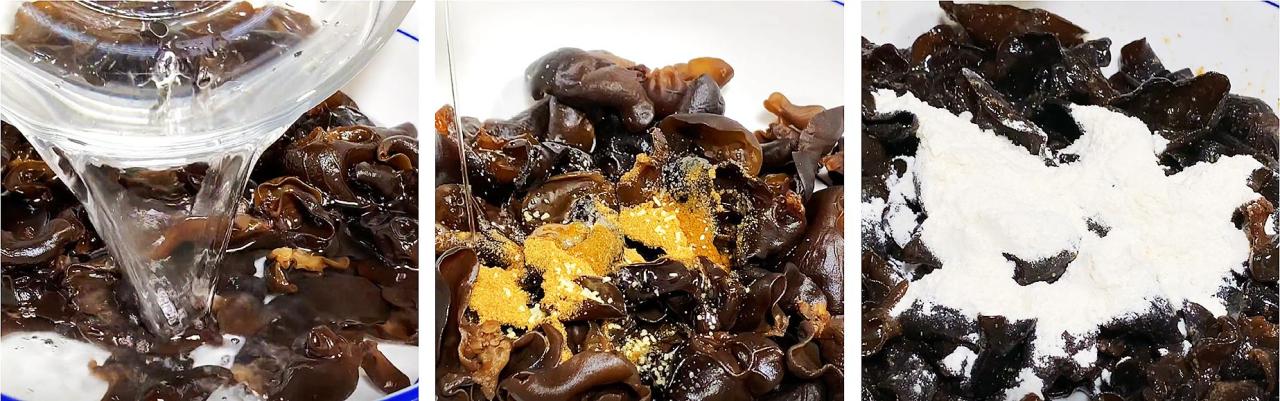 6、然后再加入一勺普通面粉,下手反复地抓拌,让每一块木耳都均匀的裹上面粉。