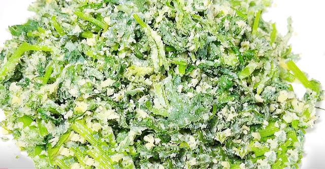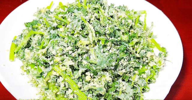 5、把搅拌均匀的面粉给倒进茼蒿里面,然后再给再次充分的搅拌均匀,面粉不用添加太多,不然吃起来比较影响口感 裹上一层面粉就可以了 给充分的搅拌均匀