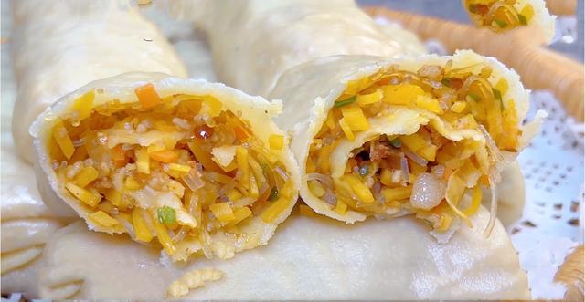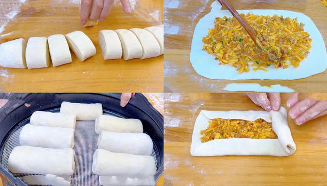 8、薄饼擀好,再放入弄好的馅料 之后被折叠 卷起来,之后再给接口处捏合好,然后再给放进蒸锅里面,所有的都弄好之后,然后再继续蒸10分钟左右