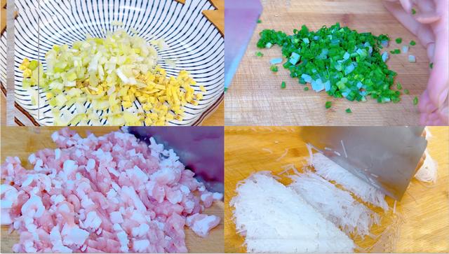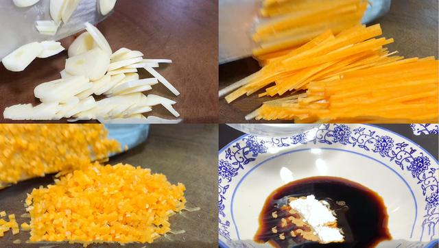 2、接下来再准备一些大葱 给切成葱话,再准备一些生姜,先切成姜丝,然后再给切成姜丁,然后再准备一些胡萝卜,洗净切成萝卜丝,然后再给切成萝卜丁,切好 再给放进碗中备用
