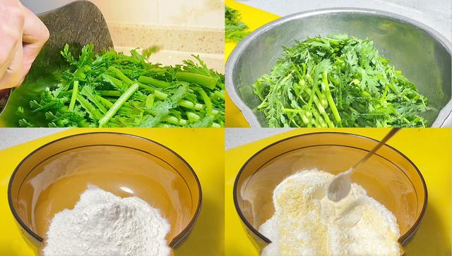 所需食材:茼蒿 面粉 玉米面 葱姜段