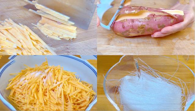 1、准备一些新鲜的红薯,先给红薯清洗一下,然后再给红薯切红薯片,之后再给切成红薯丝,尽量切得细一点,再把切好的红薯丝放进盆中,然后再添加一些盐 给充分的搅拌均匀 腌制一下
