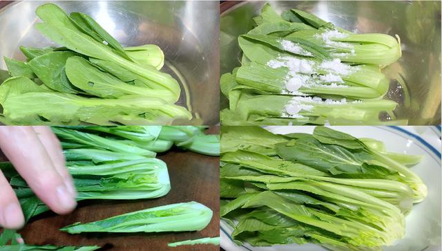 2、洗净的青菜 再给处理一下,先给青菜从中间给切开,然后再给青菜清洗几遍,多清洗一下,洗净 再给捞出控水