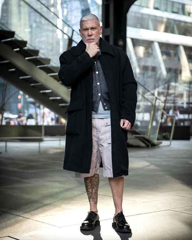 像时尚达人Nick Wooster以过膝长裤配搭长褛造型就很显矮,幸好有他帅气的外表「搭救」,才为造型挽回不少分数。