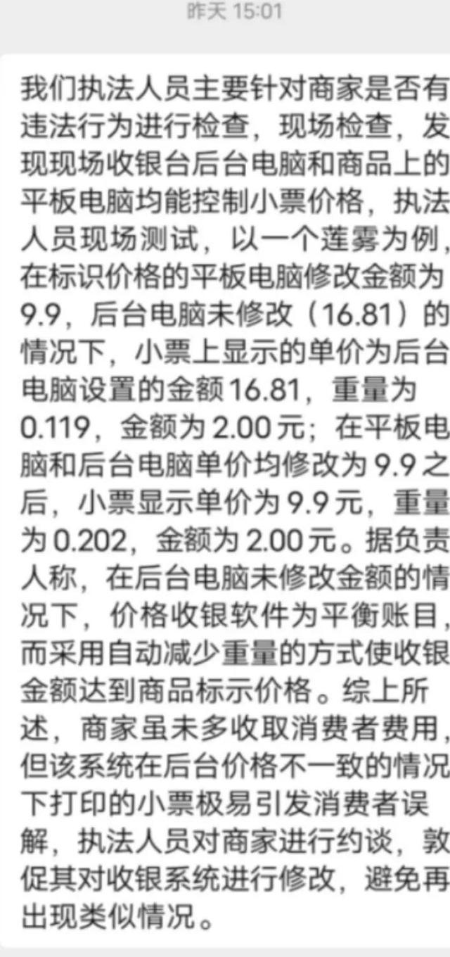 4月份在某超市买菜,喇叭一直在响,蔬菜半价,看着还行,就挑选了几样,结果到付款的时候,都是原件,更令人意想不到的1.88元一斤的土豆最后买单价是2.58一斤,找到店家却不认账,态度还挺嚣张,没办法,只能选择12315,经过相关人员一个半月的努力,终于收到回复:我们执法人员主要针对商家是否有违法行为进行检查,现场检查,发现现场收银台后台电脑和商品上的平板电脑均能控制小票价格,执法人员现场测试,以一个莲雾为例,在标识价格的平板电脑修改金额为9.9,后台电脑未修改(16.81)的情况下,小票上显示的单价为后台电脑设置的金额16.81,重量为0.119,金额为2.00元;在平板电脑和后台电脑单价均修改为9.9之后,小票显示单价为9.9元,重量为0.202,金额为2.00元。据负责人称,在后台电脑未修改金额的情况下,价格收银软件为平衡账目,而采用自动减少重量的方式使收银金额达到商品标示价格。综上所述,商家虽未多收取消费者费用,但该系统在后台价格不一致的情况下打印的小票极易引发消费者误解,执法人员对商家进行约谈,敦促其对收银系统进行修改,避免再出现类似情况。