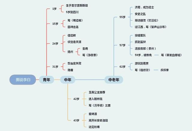 诗歌最能体现作者的心声,想深入了解一首诗词表达了作者怎样的心情,最好结合作者的生平经历,比如李白24岁远离家乡时写的《静夜思》“举头望明月,低头思故乡”思乡之情溢于言表,入仕途后写的《清平调》颇有逢迎上级的意味,从离开京城后写的《梦游天姥吟留别》“安能推眉折腰事权贵,使我不得开心颜”一句对照,不愿俯首低眉侍奉权贵而使自己曲心抑志,郁郁寡欢的心情跃然纸上。再到晚年被赦免后一句“朝发白帝彩云间,千里江陵一日还”的喜悦心情让人感同身受。本图简要梳理了李白的一生,对于了解李白的经历、了解李白笔下优美的诗句有辅助作用。