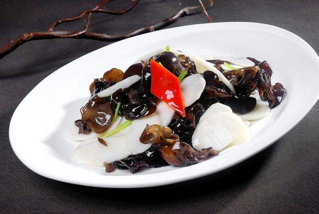 准备山药100克,泡好的木耳150克,把山药去皮切片,焯水一分钟后捞出,冷却备用。