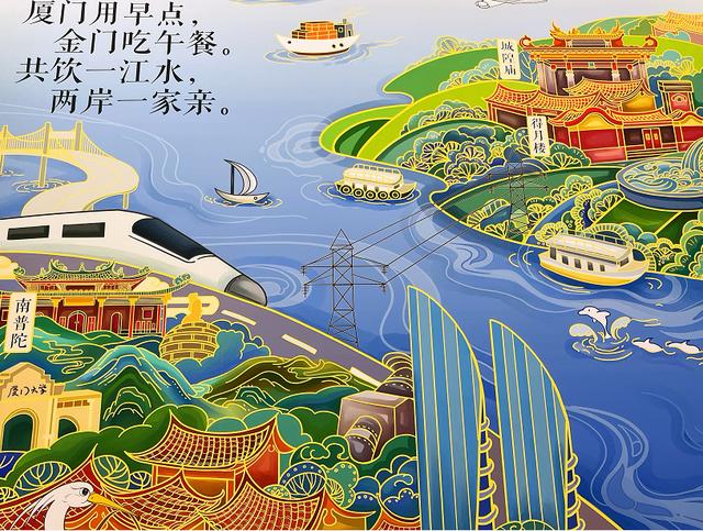 【环球时报-环球网报道 记者郭媛丹】在观看“奋进新时代”主题成就展后,台湾青年林璟雯29日下午在朋友圈发了一组图。图中有一张是在一幅色彩明丽的壁画前拍摄的,壁画中厦门金门隔海相望,画面上有郑成功像、高铁、飞机、轮船等等,上方写着“厦门用早点,金门吃午餐。共饮一江水,两岸一家亲。”