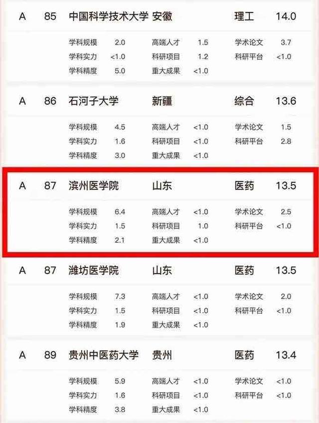 滨州医学院位于软科中国医科实力 A 大学的行列中,总排名为87!