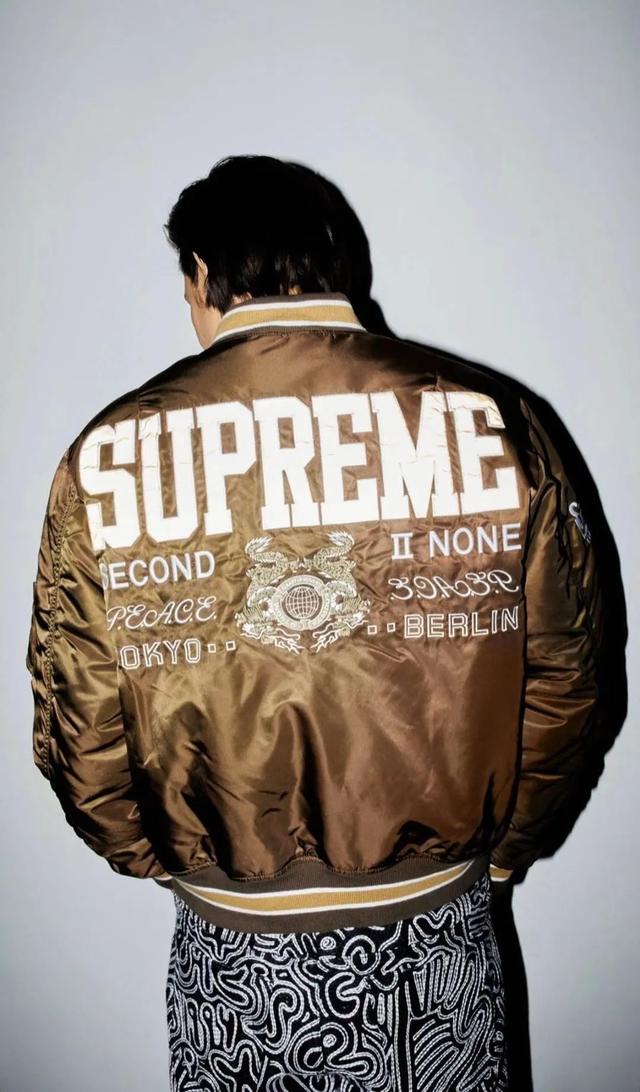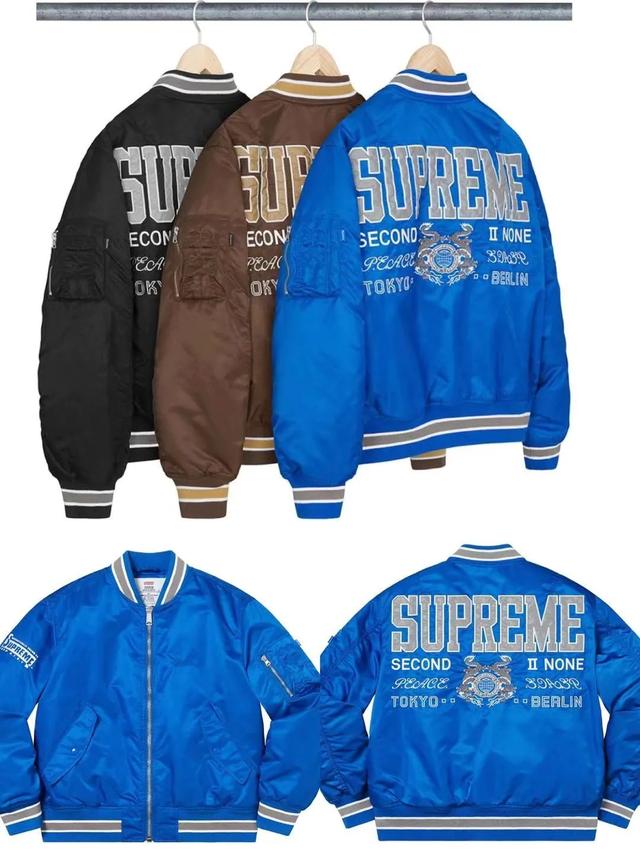 标准的MA-1夹克,内里充棉,足够应对秋冬天气,如果没记错的话Supreme是有好久没出过MA-1夹克,所以本周发售的这款还算比较热门,棕色和湖水蓝不推荐,最好搭的颜色还是黑色