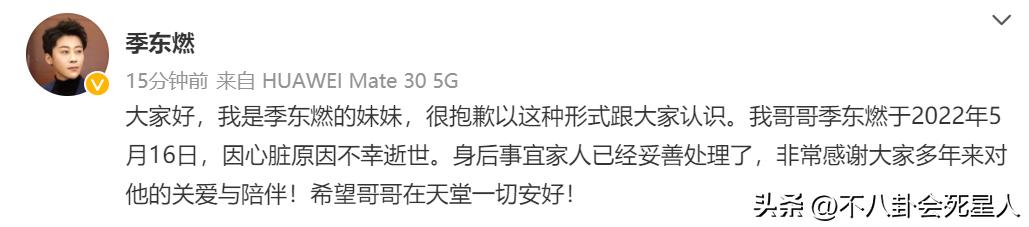 有名气的明星离开时,会有许多大咖明星在社交平台发文哀悼,但季东燃得离开,许多人知道还是因为杨幂旗下艺人刘芮麟的发文。