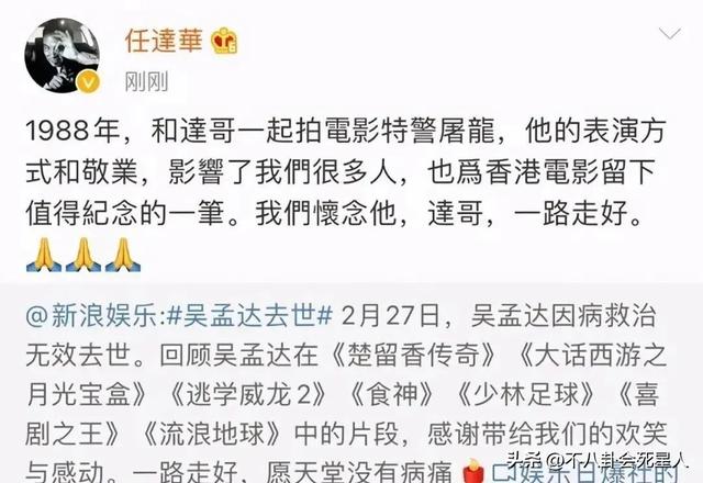 吴孟达在2021年因病离开,当时许多的明星、粉丝都在发文哀悼,任达华、林志颖、释小龙等等。