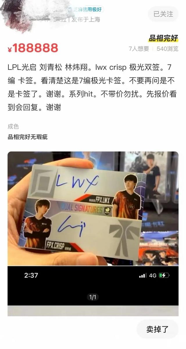 记者注意到,一张S9冠军队伍FPX选手林炜翔、刘青松的7编极光折双人签名卡在闲鱼的最高出售价为188888元。不过,有藏家告诉记者,这个价格可能是虚假标价,“这俩人的1编双签都卖不上这个价”。